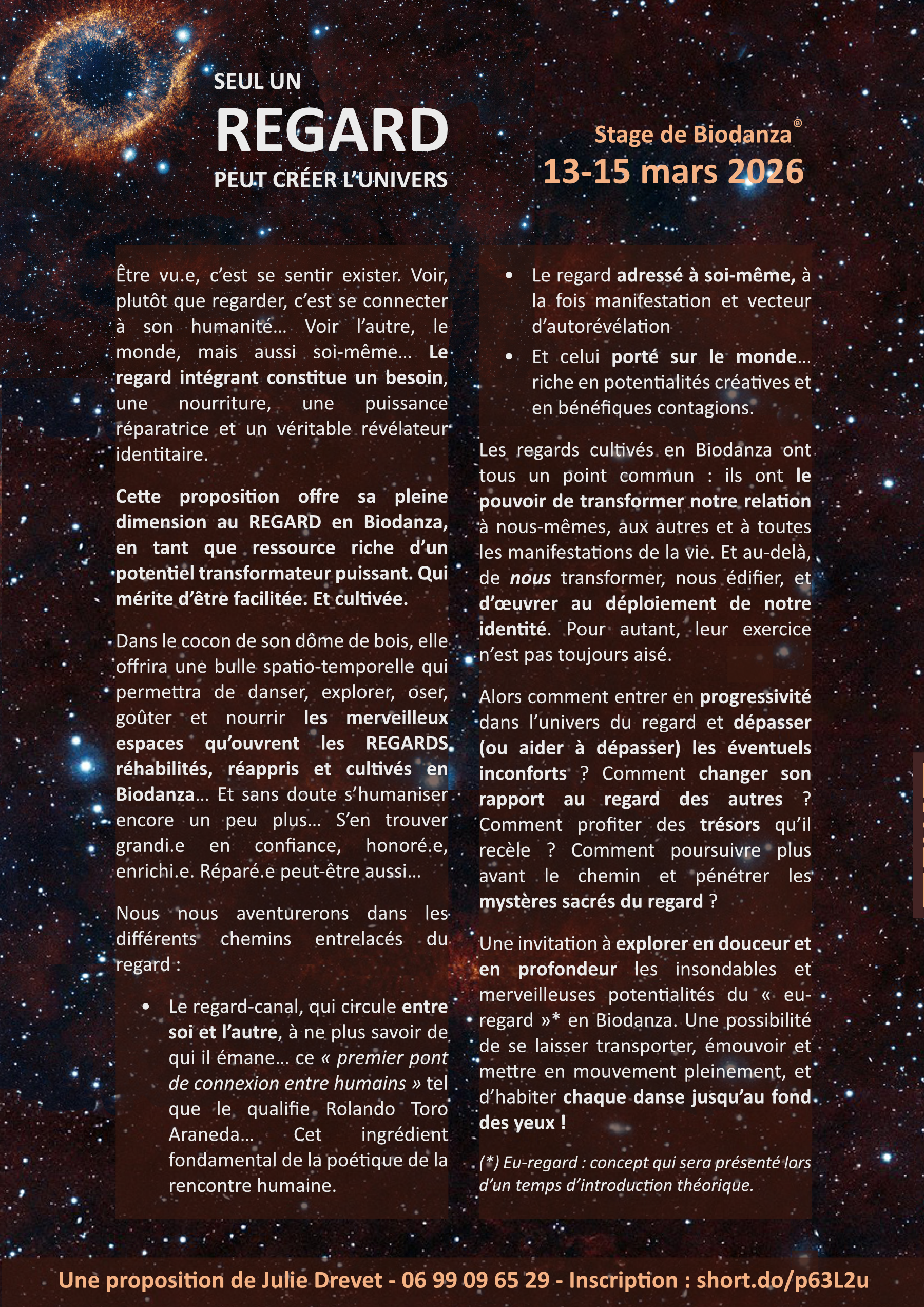 Son thème, dans le prolongement d’une période d’exploration que j'ai eu le plaisir de mener ces 5 dernières années, trouve sa source dans la MERVEILLEUSE PUISSANCE TRANSFORMATRICE DU REGARD en Biodanza. Le regard-canal, celui qui circule entre soi et l’autre, mais aussi ceux portés sur le monde, ou adressés à soi-même…